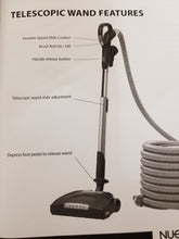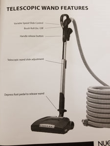 Nuera Air 35 foot hose accessory kit comes with hose, hose hanger, telescopic wand, carpet powerhead, floor brush and 3 in 1 upholstery brush, crevice tool and dusting brush with attachment holder to store on vacuum. Also comes with an 8 foot pigtail cord and a conversion kit for direct connect. A universal adapter is also included. Item number is 012334. Fits all central vacuums that use a push button tab low voltage connection.